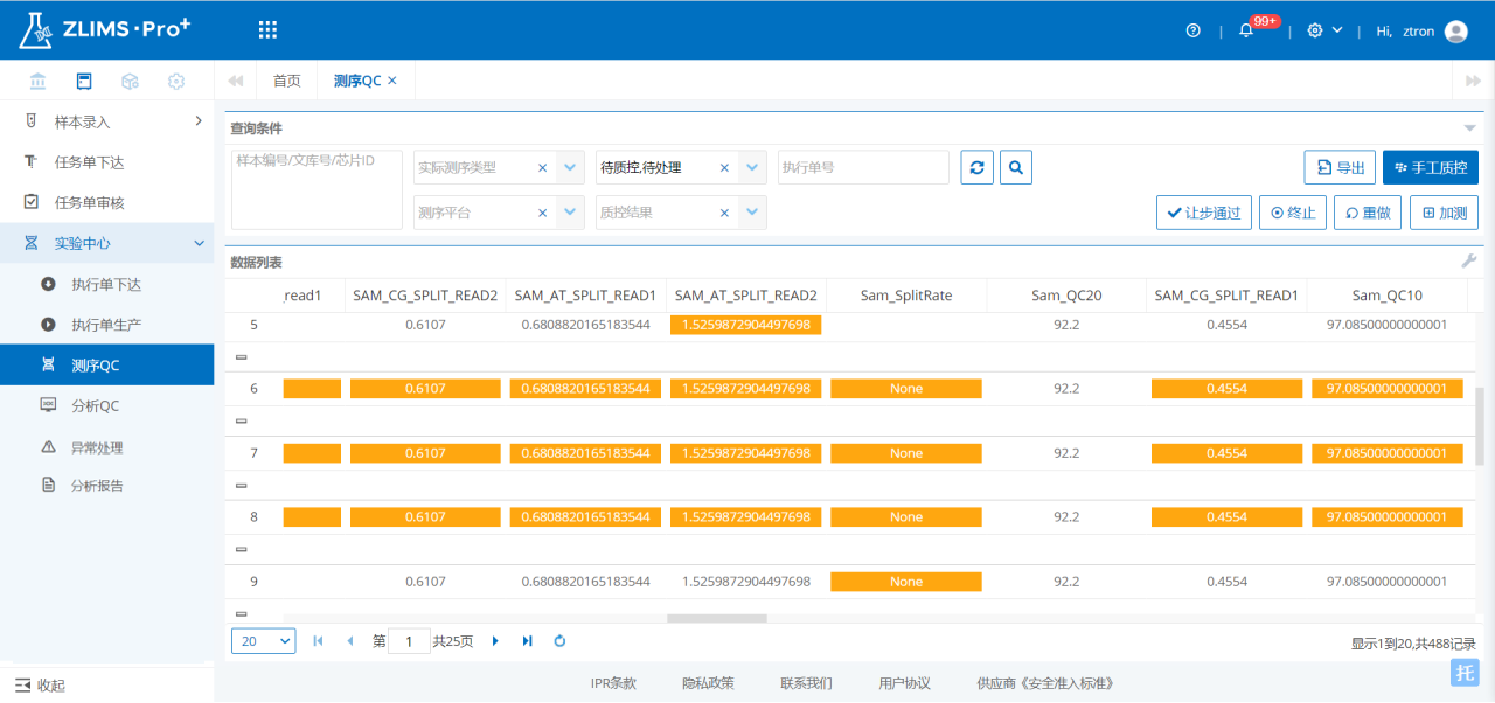按样本维度查看下机数据的质量,分析结果,可自定义质控规则,调度样本进行重建库、重测序和加测。